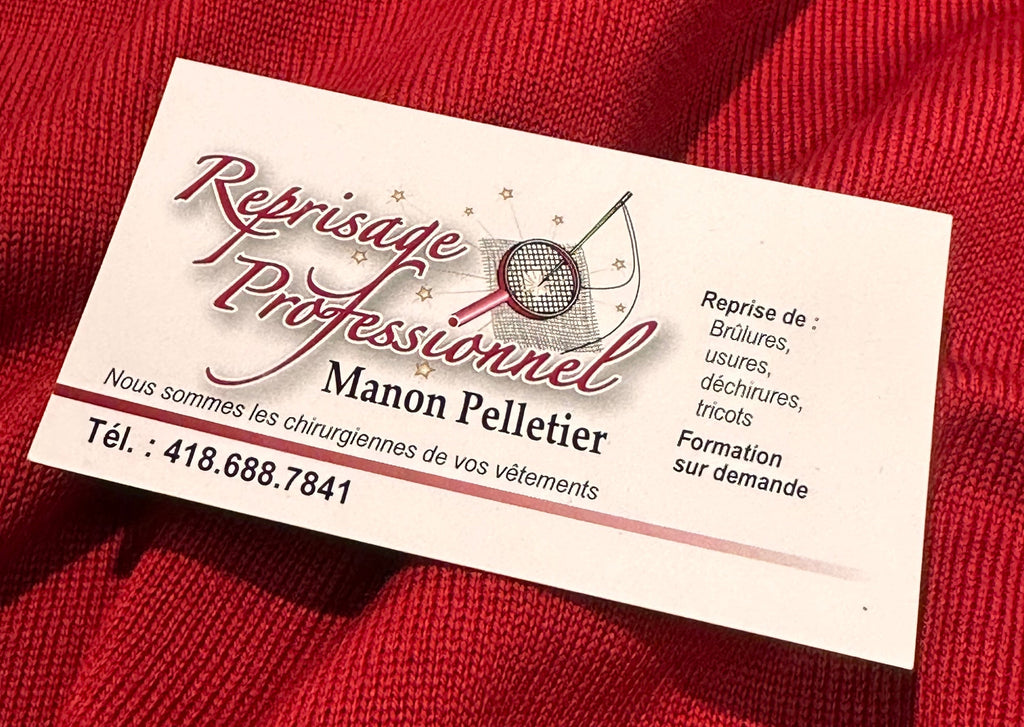 Pour bénéficier des services de réparation de Manon Pelletier, vous pouvez la contacter au 418-688-7841. N'hésitez pas à lui confier vos vêtements endommagés, elle saura les restaurer avec soin et précision.